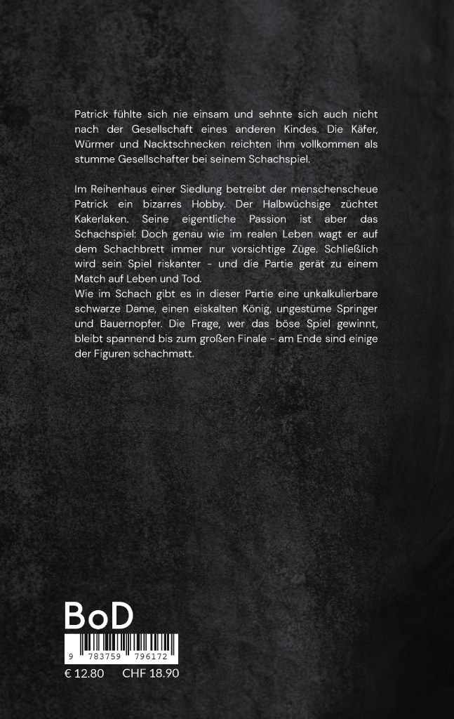 Im Reihenhaus einer Siedlung betreibt der menschenscheue Patrick ein bizarres Hobby. Der Halbwüchsige züchtet Kakerlaken. Seine eigentliche Passion ist jedoch das Schachspiel: Doch genau wie im realen Leben wagt er auf dem Schachbrett immer nur vorsichtige Züge. Schließlich wird sein Spiel riskanter – und die Partie gerät zu einem Match auf Leben und Tod …