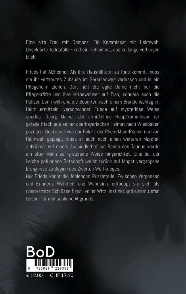 Auf humorvolle und spannende Weise taucht der Leser in die Gedankenwelt der an Alzheimer erkrankten Frieda ein. Die „Blackouts“ der liebenswerten alten Dame sorgen im Krimi für manch überraschende Wendung – um das Vergessen, Erinnern und um lange Verdrängtes dreht sich auch die Krimihandlung, die den Leser von Anfang bis Ende in ihren Bann zieht.
